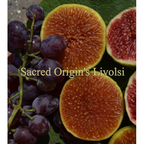 Sacred Origin's "LiVolsi" is a large, very productive and delicious apricot and banana flavored fig that has a very creamy texture. LiVolsi has a yellow exterior with a deep orange interior that is filled with honey. The tree is very productive with most nodes containing 2 figs. The harvest season is long and begins in late July and ends in November in zone 9b. You are going to love this fig. LiVolsi does not require the fig wasp for pollination. The skin is thin and the eye is closed with no figs found to have mold or bugs. When uncaprified/pollinated it displays a rich golden yellow interior.