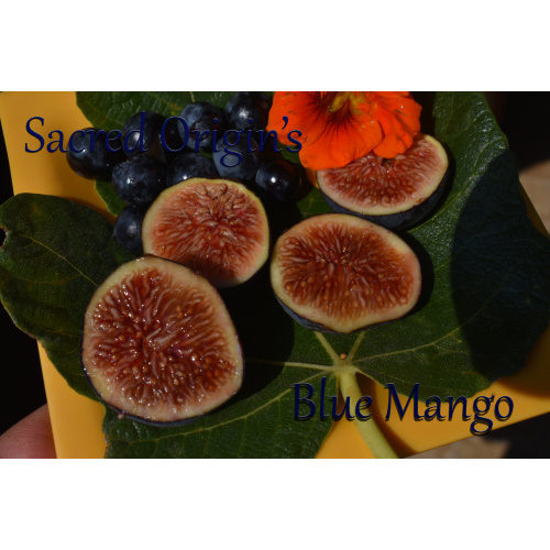Blue Mango is a striking Sacred Origin seedling distinguished by its dark, nearly blue-black exterior and vibrant mango-red interior. Its dramatic coloration alone makes it a standout, but the flavor promises just as much intrigue. The flesh is richly sweet with tropical undertones, hinting at ripe mango layered over classic fig depth. The texture is dense, syrupy, and aromatic—an enticing combination for fresh eating.